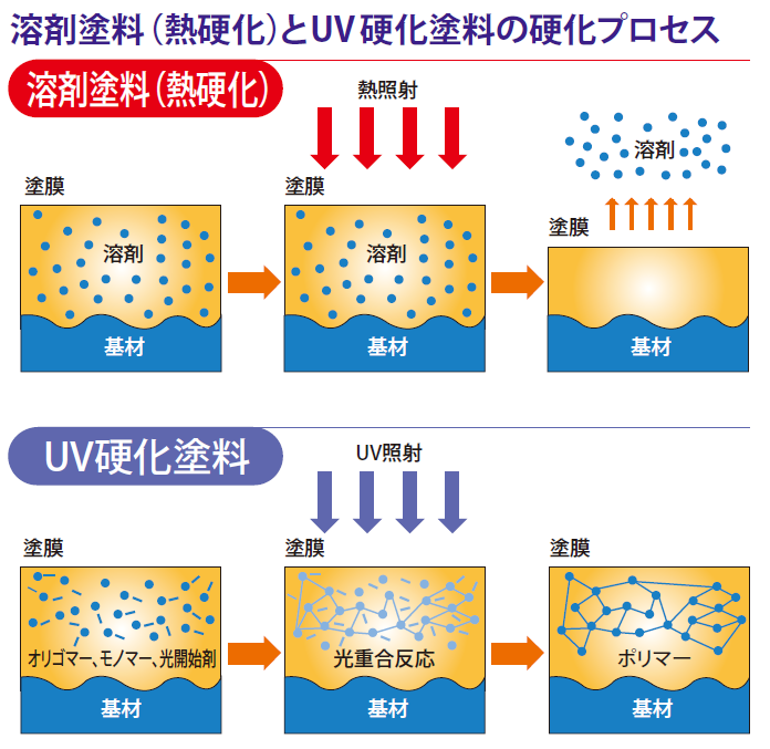 溶剤塗料とUV塗料、それぞれの硬化プロセス