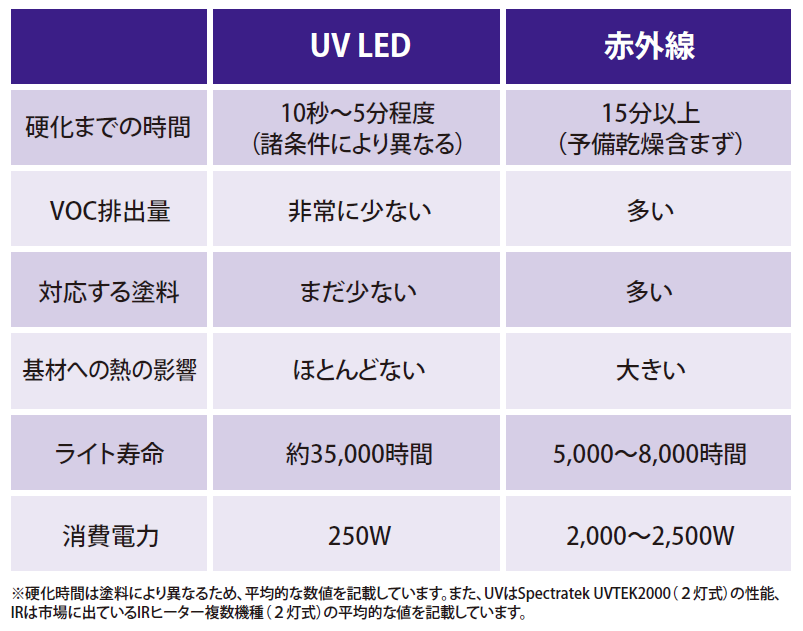 UV硬化技術はまだ発展途上であり、現在は使用できる塗料が限られていますが、従来の溶剤塗料にはないメリットを持つ魅力的な技術です。